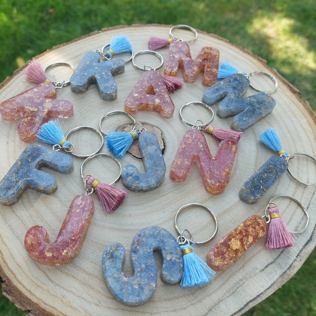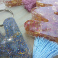 Kľúčenka zo živice vo farbách - ružová a modrá - s gypsomilkami, trblietkami a zlatými papierikmi. Súčasťou kľúčenky je aj ružový/modrý strapec.